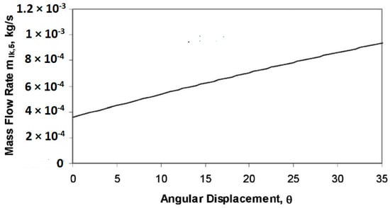 Mahmoud et al. [41] developed a detailed component model that accounts for friction losses and internal leakage in a two-phase rotary-vane expander used in heat recovery refrigeration systems. The study identified the main leakage paths resulting from assembly clearances (including axial and radial gaps) and friction losses caused by blade sliding against the cylinder and viscous resistance in the gaps. The curvature of the blade tip was identified to have a significant effect on contact with the cylinder, which, if lost, leads to a significant increase in leakage during the expansion phase. The authors indicated that using high-density material blades and optimizing rotation speed can reduce these losses. In addition, increasing the number of vanes reduces leakage through radial gaps, but at the cost of potential mechanical losses. As shown in Figure 10, the leakage into the expander cavity increases gradually with the angular displacement due to the gap between the blade face and the rotor gap. Furthermore, Figure 11 shows the difference between the ideal and actual mass flow rate through the expander as a function of rotational speed, where friction and losses due to leakage cause a noticeable deviation from the ideal performance.