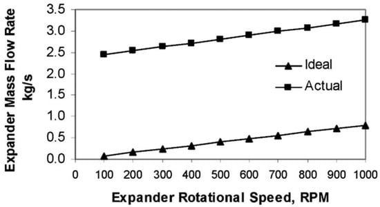 Variation in the ideal and actual mass flow rates through the expander as a function of rotational speed, reproduced with permission from [41].