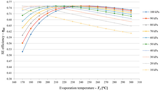 Variations in screw expander efficiency with evaporation temperature in the condensation pressure range between 0.1 and 1 bar, reproduced with permission from [42].