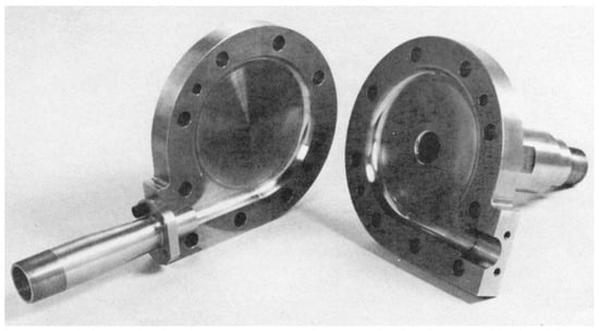 In 1968, Anisimova and Stekol’shchikov [51] investigated energy losses in two-phase flows, particularly those arising from friction at the phase interface, a critical factor associated with wetness. The study employed a theoretical approach using dimensionless analysis to quantify the loss coefficient and its dependence on key parameters. By analyzing flows with vapor quality values ranging from x = 0.5 to 0.9, the study showed that the slip factor, Stokes number, and the vapor quality significantly influence interfacial friction losses. These losses were shown to vary nonlinearly, with loss coefficients reaching magnitudes under certain conditions, such as high slip ratios or specific Stokes number ranges. This study suggests that optimizing or adjusting the Stokes number to minimize energy dissipation or balancing the slip factor could reduce the losses. In 1987, an experimental study [52] was conducted with x = 0.91–0.98 using wet steam to understand the two-phase flow effect on the Zobel-type vortex diode (a fluidic expander). This vortex diode, illustrated in Figure 14, is a non-moving part flow control device that uses vortex flow to control flow resistance. It creates high resistance in one direction (reverse) and low resistance in the other (forward). The losses occurred due to the destruction of the vortex by condensation and water buildup. It might be related to bubble formation, increased viscous dissipation, and condensation fog in the vortex core. In order to reduce it, the study suggested the use of water separators and stream traps, and changing the pipe layout to minimize water accumulation.