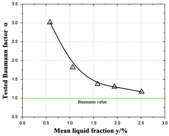 The experimental (indicated by triangle symbol) vs. theoretical Baumann factor based on the study from Niu et al., reproduced with permission from [56].
