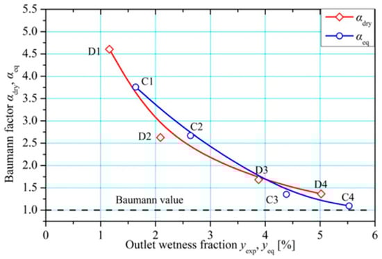 In 2011, Bakhtar and Zamri [18] conducted a simulation study validated with experimental data, which explored the nucleating wet steam loss mechanism. The results showed that the significant influence of losses due to wetness was based on supersonic nucleation, irreversible condensation heat transfer, shock weakening, boundary layer growth, and mixing between pressure and suction flows. In this case, the dominant characteristic of nucleating steam flows is the fluid’s high initial supercooling and the sudden release of latent heat as the system recovers thermodynamic equilibrium. The condensing molecules release the enthalpy of phase-change to the droplets, which then have to be transferred back to the vapor. For this purpose, a temperature difference will develop between the phases. The heat transferred internally is thermodynamically irreversible, experienced by the flow as a loss, and intrinsic to the system. In order to optimize and reduce the losses, the use of a blade profile that delays and smooths out condensation zones, controls droplet size and growth, and avoids designs that cause strong shock–wetness interactions is necessary. Their 2D unsteady simulation employed a refined inviscid Euler solver with boundary layer corrections, using a Runge–Kutta time-marching scheme on a quasi-orthogonal grid with 230 axial × 33 radial nodes. The code was adapted from Denton’s method and validated against pressure, Mach number, and droplet size data with efficiency errors <1%. Thermodynamic losses reached 5.39–6.32%, larger than the combined aerodynamic losses. Niu et al. [56] conducted experimental studies using a radial-inflow turbo expander using cryogenic air as a working fluid with a small liquid fraction (x = 0.95–0.98). The tests were carried out at Tin = 98.6–105.8 K and pin = 0.36–0.43 MPa. The results showed that the experimental Baumann factor tends to exceed 1 when the liquid fraction is below 1.5%, as illustrated in Figure 15. As the wetness increases, the Baumann factor decreases and approaches the theoretical prediction. During the expansion from a superheated state into the two-phase region, phenomena such as sub-cooling, spontaneous condensation, nucleation, and droplet growth occur. These effects contribute to significant wetness losses at low liquid fractions. This is due to the latent heat transfer and the inability of droplets to perform work. The study found that wetness losses are more severe when the liquid fraction is small. However, as the liquid fraction increases beyond 1.5%, both the efficiency ratio and the Baumann factor begin to align closely with theoretical expectations.