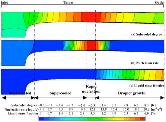 - Sun, W.; Niu, L.; Chen, S.; Sun, X.; Hou, Y. Numerical Investigation of Nitrogen Spontaneous Condensation Flow in Cryogenic Nozzles Using Varying Nucleation Theories. Cryogenics 2015, 68, 19–29. [Google Scholar] [CrossRef]