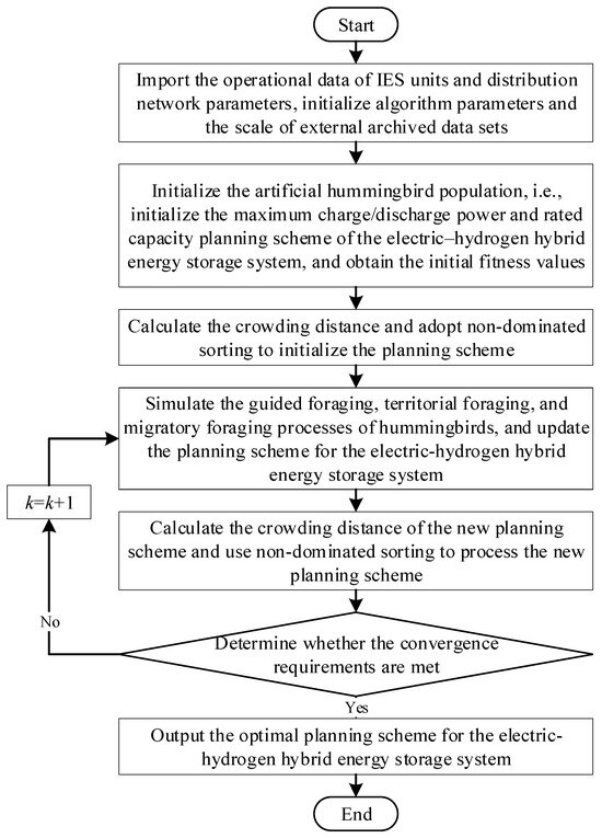 In this study, the Multi-Objective Artificial Hummingbird Algorithm (MOAHA) was employed to solve the configuration problem of electric–hydrogen hybrid energy storage systems due to its demonstrated advantages in handling non-convex, multi-objective problems. Its biologically inspired foraging strategies help avoid local optima and improve solution diversity, which is particularly beneficial for balancing cost, voltage stability, and net load fluctuation.