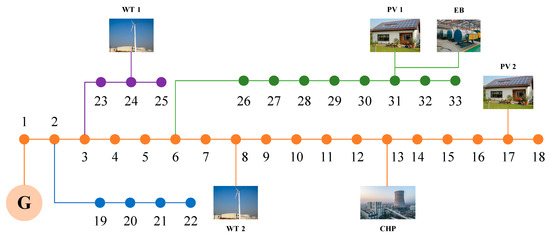 In this study, case analysis was conducted using the standard IEEE-33 node distribution network test system [33]. All simulations were performed on the MATLAB R2022a platform, with simulation hardware configured as an Intel(R) Core (TM) i5-12500 CPU (3 GHz) and 64 GB RAM. The layout of the IES is shown in Figure 2.
