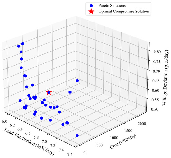 The derived Pareto front effectively balances the three optimization objectives, enabling the selected optimal compromise solution to achieve near-theoretical performance levels. Specifically, the solution attains a daily energy storage cost of USD 715.46, reduces net load fluctuation to 6.37 MW/day, and minimizes voltage deviation to 0.57 p.u./day. These metrics collectively validate the algorithm’s precision in harmonizing economic constraints with technical requirements. The cost efficiency underscores the MOAHA’s capability to optimize capital and operational expenditures, while the reduced net load fluctuation highlights its effectiveness in smoothing renewable energy intermittency. Simultaneously, the minimized voltage deviation demonstrates robust grid stability control, addressing a critical challenge in multi-energy coupled systems.
