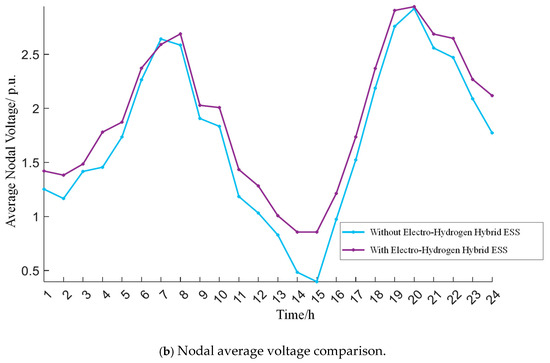 First, the implementation of a hybrid ESS demonstrates substantial voltage regulation benefits across IES nodes, particularly in networks with inherently low net load baselines. By strategically modulating charge–discharge cycles, the ESS effectively elevates minimum voltage thresholds while compressing voltage deviation ranges, transforming previously uneven voltage distributions into stable operational profiles. This voltage enhancement mechanism proves especially potent during load valley conditions, where ESS charging operations actively counteract voltage depression by elevating net load levels—a counterintuitive yet effective strategy that repurposes energy storage as both load-shaping and voltage-support infrastructure.
