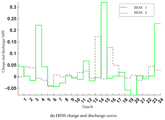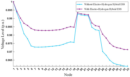 In the MOAHA, the hummingbird flight coefficient was set to 1, and the maximum number of iterations, , was set to 200. Furthermore, to evaluate the impact of the electric–hydrogen hybrid ESS configuration on the system’s voltage distribution, different scenarios were designed for comparative analysis, as detailed below:
