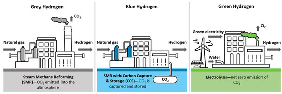 Hydrogen production in the upstream stage of the HSC is typically categorized by “colors” based on the production methods and environmental impacts (Figure 2). Grey hydrogen, the most common type, is produced from natural gas via Steam Methane Reforming (SMR) without carbon capture, making it the least environmentally friendly. Blue hydrogen uses the same process but incorporates Carbon Capture and Storage (CCS) to reduce emissions. Green hydrogen, the most sustainable option, is produced by electrolyzing water using renewable energy sources like wind or solar, emitting no greenhouse gases. Operational challenges in the upstream process often relate to hydrogen source assessment and supplier selection. These include evaluating the geographic availability of production methods and the technological maturity of suppliers [11]. Several studies have examined renewable energy sources across diverse regions to assess the green hydrogen potential [12,13,14], highlighting the impacts of regional characteristics on hydrogen sourcing. Additionally, various components of a supplier assessment across the HSC are explored in other studies, as discussed in the next subsection.