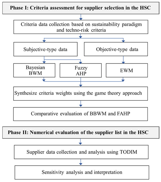The methodological flow for the supplier selection problem in the HSC context is illustrated in Figure 3. It is structured into two main phases. The first phase focuses on the assessment of criteria for supplier selection in the HSC, aiming to identify and evaluate the most critical factors. The process begins with defining evaluation criteria based on expert input and a comprehensive literature review. These criteria are then refined and categorized under the sustainability paradigm and techno-risk dimensions, encompassing economic, environmental, social, operational capacity and efficiency, and risk management aspects. An integrated MCDA framework is subsequently applied to determine the weight of each criterion, incorporating both objective and subjective evaluations from three domain experts. In application-oriented research, particularly in complex decision-making contexts like supplier selection, expert input plays a critical role in capturing domain-specific knowledge and contextual judgment that are not easily quantified. The number of experts used in this study aligns with practices commonly reported in the literature, where expert panels typically range from as few as 3 to more than 15 participants, depending on the specificity of the problem and the level of expertise required [44,45]. In the context of supplier selection within the HSC, focused decision problems involving a managerial team of highly experienced experts are considered both practical and valid for obtaining reliable input.