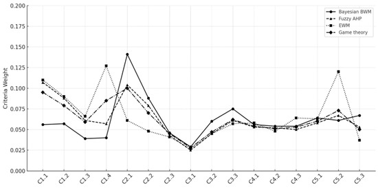 Next, to quantitatively assess the stability of the aggregated weights obtained from the game theory approach, we apply the Weighting Stability Coefficient (WSC) introduced by [73], which can be used to measure synchronization consistency among pairs of weighting vectors. In particular, the WSC can be computed as shown in Equation (27) to assess a set of weights derived from different subjective weighting methods, where a higher WSC indicates greater stability and reliability of the weighting results. Table 8 presents the WSC analysis among the Bayesian BWM, Fuzzy AHP, EWM, and the game theory-integrated weight vectors. The WSC values between the individual methods range from 0.7646 (Bayesian BWM vs. EWM) to 0.8585 (Fuzzy AHP vs. EWM), with an average of 0.8228, indicating moderate to strong consistency among techniques. Notably, the WSC values between each individual method and the game theory weights are higher, ranging from 0.8621 to 0.9238 with an average of 0.8953. This suggests that the game theory-based aggregation harmonizes divergent priorities by aligning closely with all methods. The improved agreement reinforces the effectiveness of the game theory approach in resolving conflicts between subjective and objective weighting schemes in this study.