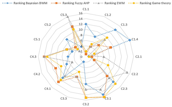 Finally, the game theory approach is used to synthesize the criteria from both the subjective and objective weighting methods to obtain the final combined criteria weight for ranking suppliers in the HSC case study. This approach minimizes the maximum discrepancy between the combined weights and the individual weight sets to ensure equilibrium and weight stability in the context of this study. In other words, a stable combined weight is achieved, where no criterion or decision-maker can improve their outcome by changing their weight, given the weights of others, leading to a balanced result. The overall results from the game theory approach indicate that the most important criteria across all main categories are cost (C1.1), carbon footprint (C2.1), occupational health (C3.3), distribution network (C4.2), and geopolitical risk (C5.2). Figure 4 illustrates the comparisons among the methods used to quantify the criteria weights. Additionally, the criteria ranking results are illustrated in a radar chart in Figure 5. Clearly, trade-offs exist across the different ranking methods, with noticeable variations in how each method prioritizes sub-criteria. Among them, the game theory-based method provides a more balanced prioritization, avoiding extreme highs or lows in the ranking by considering the strategic interactions among criteria. As a result, the game theory-based framework provides a robust approach for decision-making contexts that require compromise and stability across multiple evaluation dimensions. It is noted that the combined weights obtained from the game theory approach will be used to evaluate the supplier selection problem in the HSC in the next phase.