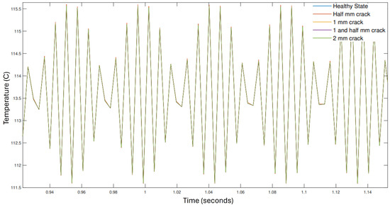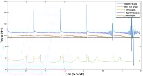 As previously mentioned, we will use the features of the collected signals to train both data-driven methods. Figure 1 shows instantaneous machine torque in different machine states. The considered faulty states in this study are radial cracks with the following depths: 0.5 mm, 1 mm, 1.5 mm and 2 mm. Figure 2 shows temperature for different machine states. Figure 3 shows vibration for different machine states.