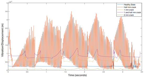 The Paris equation helps in calculating the remaining cycles of the system before it reaches the final state. The considered crack depths are 0.5, 1, 1.5, and 2 mm. The RUL model will be linked to one of the machine’s vital monitored parameters in the CBM, and that is largely affected by the studied fault. The considered parameter to be used in the RUL calculation is the vibration. The relevant vibration for each crack depth is collected from an FEM model built in [27]. The RUL is expressed in cycles. Vibration versus system cycles is shown in Figure 6.