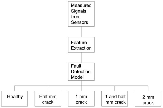 A fault detection strategy using the multi-class support vector machine will be implemented to discover the presence of a magnet’s crack at an early stage and determine the precise length of this crack. Our model will be trained on features extracted from torque, vibration and temperature measurements. The raw dataset acquired from the three sensors is analyzed over a single machine revolution, consisting of 200 sampling points. The output will be the state of the machine, whether it is a machine in good condition or a machine with a magnet crack of different lengths. The chart in Figure 4 represents this procedure.