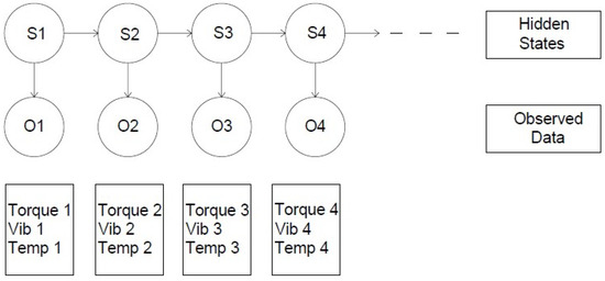 To train the five HMM models, the iterative algorithm of Baum–Welch was used. The training process utilizes 80% of the treated data. Accordingly, for each model, the number of observations should be determined. For each state, we select three unique observations that best capture the observed data. The torque, temperature, or vibration sensor measured values will be the observation in our application. It is important to supervise three observers in every state to avoid false alarms. For each state of the machine, the raw data set, coming from the three sensors, is examined over one machine revolution with 200 sampling points. Figure 5 represents the HMM trellis diagram of the healthy state. Five HMMs are created similar to this one.