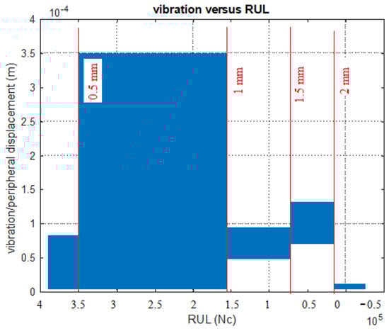 The suggested RUL calculation strategy in this section is based on a merge between lifetime data and real-time data. The lifetime data is the vibration versus life cycle of the machine for different crack depths coming from the Paris equation model, and the real time data is the monitored vibration data coming from the vibration sensor. The block diagram of this RUL calculation strategy with an illustrative application is shown in Figure 7. First, the SVM model specifies the radial depth of the crack; then, the RUL interval of the relevant crack will be located. Then, vibration data from the beginning of the defect will be collected and checked. And the corresponding RUL will be specified.