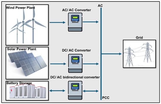The core components of co-located HPPs considered in the study typically include a WPP, SPP, and BESS, as shown in Figure 1. WPP and SPP are the main power generators that convert wind speed and solar irradiance, respectively, into electricity. BESS helps manage energy by saving extra power when it is available and using it when there is not enough, and it includes systems like inverters that change direct current (DC) to alternating current (AC) and the other way around to work with the grid.