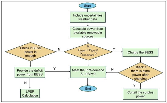 Energy management strategies are critical for enhancing system performance while ensuring reliability. This study illustrates the implemented energy management strategy in Figure 2. The process begins by calculating power generation using uncertain weather data, grid demand, and component specifications. A rule-based control algorithm is integrated into the MOPSO framework to manage energy flow. WPPs and SPPs serve as the primary energy sources, with BESS playing a supportive role. When renewable energy generation exceeds PPA demand, the excess power is used to charge the battery storage. If the BESS reaches its SOC, any additional surplus power is curtailed. Conversely, the system deploys the stored battery energy to meet load requirements when renewable generation falls short of demand. In scenarios where both renewable resources and battery storage are insufficient to meet grid demand, the system calculates the LPSP to assess reliability.