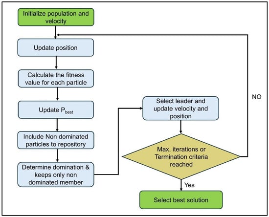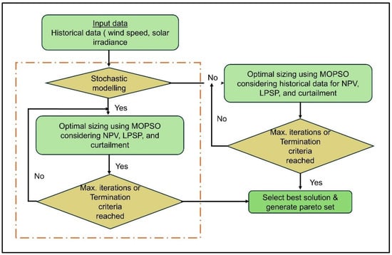 This study chooses MOPSO because it is effective and adaptable for tackling complicated sizing problems that involve continuous variables. Unlike GA or NSGA-II, which usually need more computing power to keep a variety of solutions, MOPSO uses swarm intelligence and Pareto dominance sorting to find solutions more quickly and spread them out better in complex search areas. This makes it especially suitable for optimizing hybrid renewable systems under probabilistic uncertainty and policy incentives.