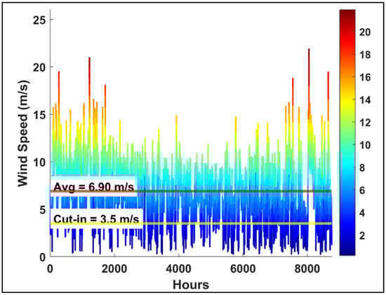 The wind speed at the desired hub height, , is calculated using the power law as given in Equation (1) [27].
