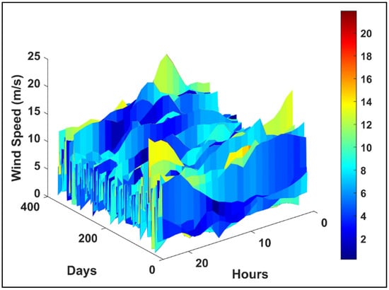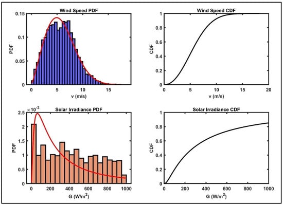 The PDF of wind speed, , is defined using the Weibull distribution in Equation (10).