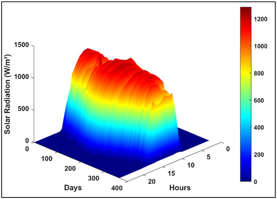 The output power of a single solar PV panel is calculated using irradiance and temperature conditions, as shown in Equation (5) [28].