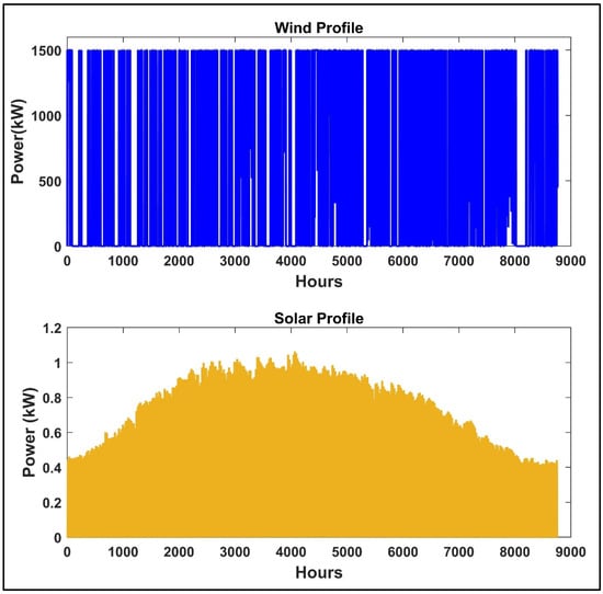 The power output of the wind turbine at wind speed is determined by the power curve, as shown in Equation (2), whereas the turbine output is further bounded by rated power and cut-in/cut-off wind speeds, as described in Equation (3) [27].