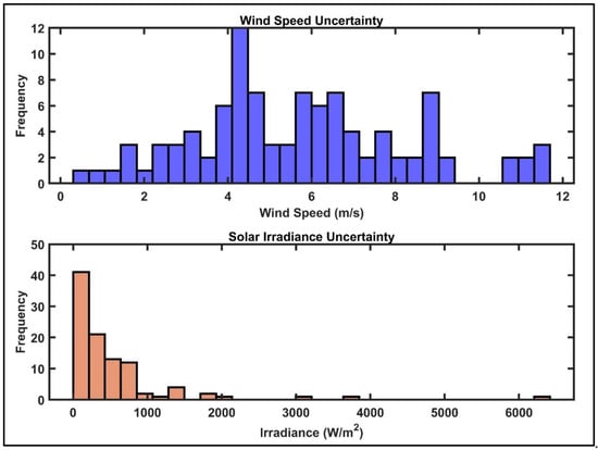 Solar irradiance uncertainty is modeled using a lognormal distribution, which reflects the positively skewed nature of solar radiation data. This distribution is well suited for capturing the variability in solar availability, as solar irradiance tends to fluctuate significantly and can change rapidly. The PDF for solar irradiance, , is modeled using the lognormal distribution, as shown in Equation (12) [31].