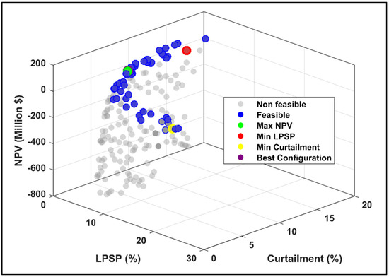 The proposed three objectives are mathematically dependent on the main system sizing parameters , , and . Specifically, increasing or raises the total renewable generation, directly impacting energy revenue and, therefore, the NPV. Likewise, a larger allows surplus generation to be stored and later dispatched to meet the grid demand, which helps reduce LPSP and curtailment by balancing supply fluctuations. The objective function is designed to reflect these clear connections, making sure that the optimization algorithm works together to achieve economic, reliability, and efficiency goals.