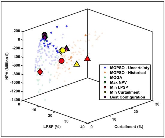The multi-objective framework in this study considers the inherent trade-offs and mutual incentives between economic performance (maximizing NPV), system reliability (minimizing LPSP), and operational efficiency (minimizing curtailment). These objectives are not always aligned: The higher the degree of reliability, the greater the degree of oversizing of generation, storage capacity, and, therefore, capital expenditure, while also possibly harming the NPV due to higher capital costs in the beginning. On the other hand, economic optimization results in leaner sizing of the system, which might result in higher LPSP and loss of load during periods of low generation. Reducing the curtailment is beneficial for integrated renewable energy use and revenue; however, in most cases, it requires flexible storage or grid export, causing additional expenditures. This interrelationship directly affects the way in which the constraints are turned into a fitness function, as well as the way in which the MOPSO algorithm balances between exploration and exploitation to find a set of Pareto-optimal solutions that become an acceptable compromise between all these conflicting goals.
