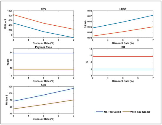 To evaluate economic viability, this study utilized NPV as a key indicator of economic performance. Although it is often difficult to appropriately model all the financial considerations, this study approximated simple revenue. Investment is considered worthwhile if the NPV is zero or positive [32]. The NPV is calculated using the discounted cash flow approach as given in Equation (16).