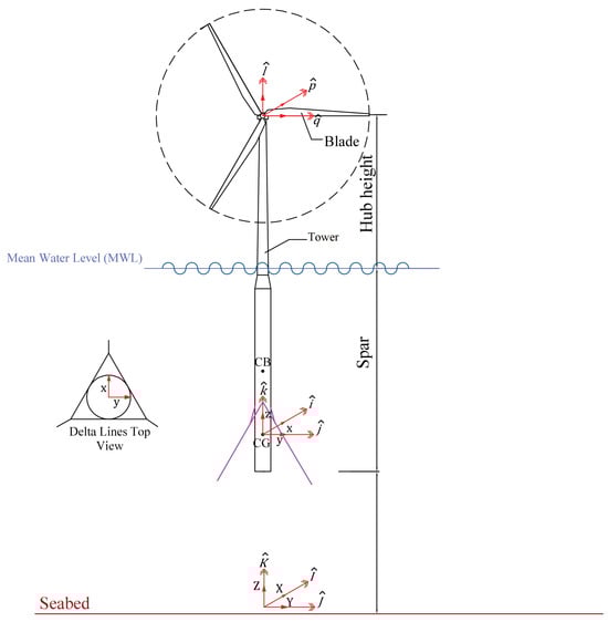 Configuration of a spar-type FOWT, and the used coordinate systems [29].