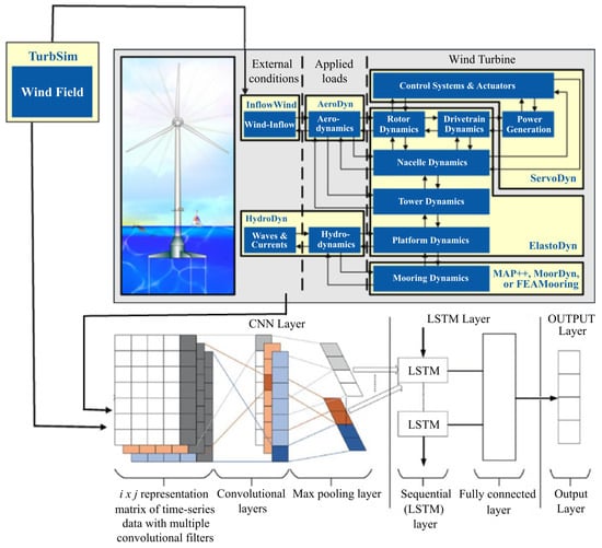 The over-reliance on fossil fuels has led to pressing global challenges, including climate change and environmental degradation, primarily driven by greenhouse gas emissions from human activities [1]. Renewable energy sources have emerged as critical alternatives, offering sustainable and cleaner options to mitigate these issues. Among them, wind energy plays a pivotal role, accounting for approximately of the global renewable energy expansion, as reported by the International Energy Agency (IEA) [2]. Offshore wind energy, particularly in deep-sea environments, holds great promise due to its higher and more consistent wind speeds. Floating offshore wind turbines (FOWTs) have become a focal point in harnessing these resources efficiently [3]. However, designing and optimizing FOWTs remains highly complex, requiring a multidisciplinary approach that spans aerodynamics, hydrodynamics, structural dynamics, and control engineering. Traditionally, assessing the performance of FOWTs has relied on high-fidelity numerical simulations. While these models—such as those using OpenFAST or similar tools—are powerful, they often entail intensive computational costs and are sensitive to assumptions, input quality, and environmental variations [4,5]. Their scalability and adaptability are limited, especially when evaluating a wide range of operating conditions or turbine configurations. In contrast, data-driven approaches, particularly machine learning (ML), have emerged as powerful alternatives. These models can learn complex, nonlinear mappings from historical data and generalize across new scenarios with reduced computational load once trained [6,7]. Advanced ML algorithms—such as artificial neural networks (ANNs), support vector machines (SVMs), support vector regression (SVR), and neuro-fuzzy models—have been successfully applied to various aspects of wind energy systems, including short- and long-term time-series forecasting [8,9,10,11,12]. More recently, deep learning neural networks (DLNNs) have shown substantial promise in handling the inherent nonlinearities and temporal dependencies of offshore wind systems. Models like convolutional neural networks (CNNs), recurrent neural networks (RNNs), gated recurrent units (GRUs), and long short-term memory (LSTM) networks have been widely used in maritime and energy domains due to their ability to process sequential data and capture hidden temporal patterns [13,14,15,16,17]. For example, LSTM networks have been utilized to forecast wind speed and wave height using offshore NOAA buoy data, achieving RMSEs of and , respectively—enabling better metocean forecasting and turbine maintenance planning [18]. Beyond meteorological forecasting, deep learning has also been applied to structural health monitoring and load prediction in wind turbines [19,20]. Choe et al. [21] employed GRU and LSTM models to detect structural damage in FOWT blades. Similarly, Li et al. [22] integrated physics-based constraints into a deep residual RNN (DR-RNN) to predict dynamic responses of bottom-fixed offshore wind turbines, achieving a balance between data efficiency and model accuracy. Chen et al. [23] used a five-layer feedforward neural network trained on mooring load data from a coupled simulation to predict line tension under various scenarios, while Khazaee et al. [24] and several other efforts have focused on combining numerical model outputs with deep learning. Wang et al. [25] used OpenFAST-generated data to train a multi-layer perceptron (MLP) model for predicting tower responses. Similarly, Ostovar et al. [26] used MLP to optimize steel structure design. Pandit et al. [27] used an RNN for sequential condition monitoring of onshore turbines based on SCADA datasets. Despite notable advancements, the use of deep learning—particularly hybrid deep learning models—for directly predicting power output from FOWTs remains limited. Existing research has largely concentrated on load forecasting, structural health monitoring, or analysis of metocean parameters, with relatively few models developed for direct energy production prediction [28]. This study seeks to enhance machine learning techniques for forecasting the power output of FOWTs. To this end, we propose a novel hybrid deep learning framework that combines OpenFAST numerical simulations with a CNN-LSTM architecture to accurately predict power generation. This hybrid approach leverages the physical accuracy of OpenFAST and the data-driven adaptability of deep learning, offering improved prediction accuracy, reduced computational requirements, and practical relevance for real-time deployment in offshore wind operations.