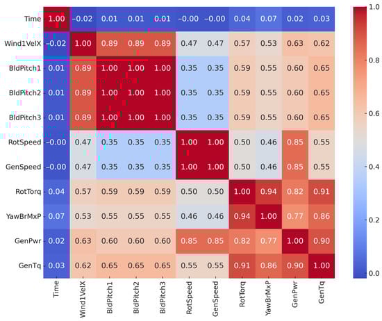 The present study employs OpenFAST software to obtain a set of 336 outputs for dynamic response analysis and power prediction of a spar-type FOTW. Considering the Nyquist criterion, dynamic system characteristics, numerical stability criteria, and guidelines from OpenFAST documentation and iterative testing, the time step for all simulations is set to 0.0125 s, which is small enough to accurately capture the dynamic characteristics of the system and avoid numerical instability. Each output file comprises 141 columns that reflect various features, and because each simulation lasts 800 s, each output file contains a total of 64,002 rows. To avoid introducing noises to the model prediction and capture dependencies and trends in generated power, the sampling frequency of data decreased to 1 s. Next, all output files are combined to create a comprehensive dataset for the deep learning model. The correlations between generated power and other features were examined in order to identify features whose previous values may be relevant in predicting generated power future values. From the correlation analysis, nine features that are highly correlated with power generation were chosen (Figure 3).