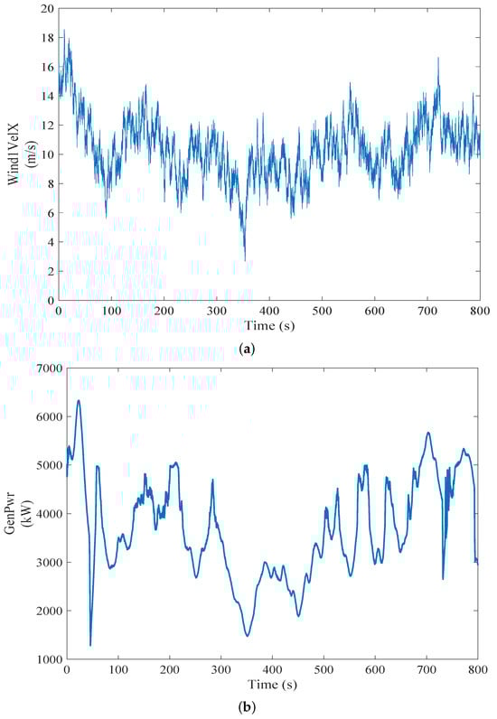 (a) Wind velocity (m s−1) in x direction and (b) generated power (kW) for load case w3s1d1.