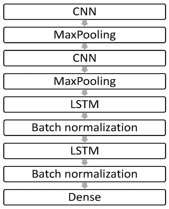 The proposed hybrid deep learning architecture combining CNN and LSTM networks uses the Sequential API from Keras-TensorFlow, which is a high-level neural network library used for time-series data processing. In this architecture, local features are extracted by CNNs, where LSTM layers capture long-term dependencies to predict generated power. The first layer is a 1D convolutional (Conv1D) with 120 filters and a kernel size of three. This layer uses the ReLU activation function and is designed to process the input sequence data. The choice of 120 filters is a design parameter representing the number of feature maps generated, and the kernel size of three indicates the width of the convolutional window. After each convolutional layer, a max-pooling layer (MaxPooling1D) with a pool size of two is also applied. This pooling layer reduces the dimensionality of the data, which reduces computational load and controls overfitting by providing an abstracted form of representation. The model used in this study incorporates LSTM layers. The first LSTM layer has 50 units and returns sequences, which means it outputs the entire hidden state sequence. The training process is then stabilized and accelerated using a batch normalization layer. The next layer is the second LSTM layer with 50 units without returning sequences. It simply returns the output of the latest time step, thus capturing the long-term dependencies of the data. Following this LSTM layer is another batch normalization layer. The final layer of the model is a dense layer (Dense) with a single unit. The single unit indicates that the model generates a single continuous value or probability score. The Adam optimizer is used to compile the model, which is a common choice for deep learning applications due to its efficiency in dealing with sparse gradients and flexible learning rate capabilities. The loss function in this study is set to mean squared error, which is a common choice for regression situations [36]. Figure 5 indicates the basic structure of the proposed multivariate CNN-LSTM model for multiple time-series prediction with 14 features and ten time steps for the prediction process.
