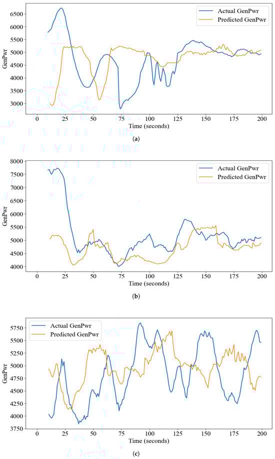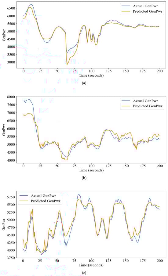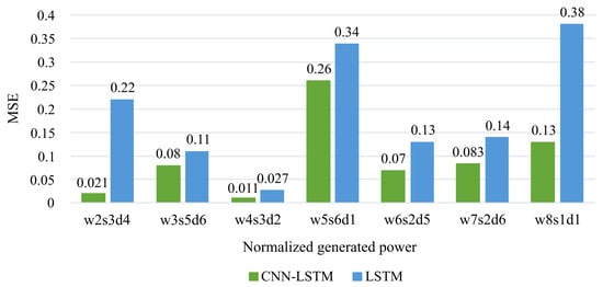 The on test data is approximately 0.016. This low value of test data prediction MSE indicates a high level of accuracy in the model’s predictions. Since is sensitive to data scale and outliers, it shows that the model’s predictions closely match the actual values of generator power. The test data prediction for simple two-layer LSTM is 0.021, which does not show a significant improvement for this study’s suggested hybrid model architecture. Still, further comparisons revealed that the LSTM model’s tendency to overfit certain load cases in such complicated multi-variable parallel time-series could falsely cause reports for low overall . In contrast, it shows poor results for some other load cases. Figure 6 compares the for normalized generated power values predicted using the LSTM model and the proposed CNN-LSTM model in this study for three load cases. As can be seen, LSTM cannot capture dependencies in the load case despite having a relatively small overall for predicted data.
