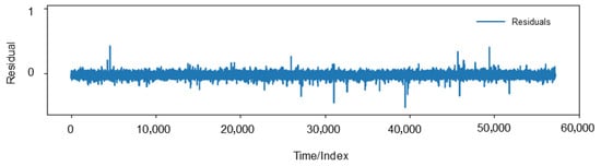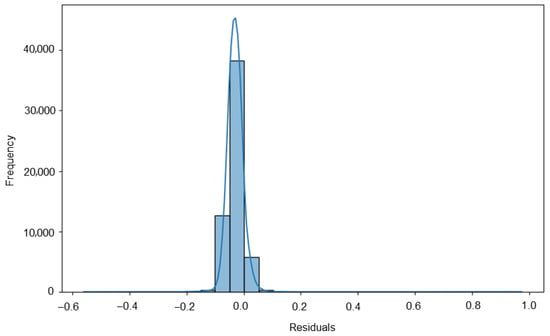 In statistical measures of the model’s error (residual) analysis, several critical aspects of the model’s predictive behavior were discerned. The model’s minor tendency to underestimate the target variable is continuously hinted at by the mean of the errors, which stands at −0.029. Despite its mildness, this trend is notable for its relative consistency, and the small mean error magnitude indicates that there is no major bias toward either overestimation or underestimation. This inference is further supported by the median of the errors, which stands at −0.030. The mean and median both have negative values and are closely aligned, which highlights a consistent pattern of small underestimation across the model’s predictions.