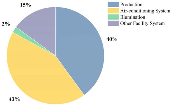 The air conditioning system constitutes one of the primary sources of energy consumption within cleanrooms, typically accounting for 40–60% of the total cleanroom energy use [9]. This high energy consumption phenomenon mainly stems from the need for high air change rates, complex air treatment processes, and continuous year-round operation to ensure environmental stability and cleanliness [10,11]. In addition, the multi-stage configuration of air filtration systems leads to increased airflow resistance, further elevating fan energy consumption. As illustrated in Figure 1, the energy consumption of cleanroom air conditioning systems even surpasses that of production processes [12]. This phenomenon underscores the critical role of air conditioning systems in the overall cleanroom energy management strategy, highlighting the urgent need for effective energy-saving operation strategies and control algorithms.