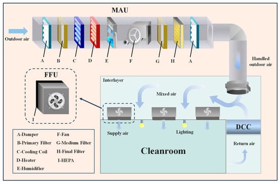 In industrial cleanrooms, air conditioning systems are commonly composed of the MAU, FFU, and DCC (as shown in Figure 2). The MAU first pretreats the outdoor fresh air through filtration, cooling, heating, dehumidification (or humidification) processes to meet the cleanroom requirement. Then, the processed air is conveyed through air ducts to the cleanroom interlayer, where it mixes with return air that has been conditioned by the DCC in terms of temperature and humidity. Subsequently, the mixed air passes through the high efficiency particulate air filter (HEPA) of the FFU, thereby ensuring that the indoor air quality satisfies the cleanliness requirements [17].