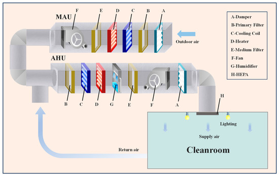 In pharmaceutical cleanrooms, the MAU + AHU system is commonly adopted (Figure 3). For this configuration, the MAU performs necessary preliminary treatments for fresh outdoor air such as filtration and cooling. Then, the treated fresh air is mixed with the return air and directed into the AHU, where it undergoes further processing, including temperature and humidity control as well as additional filtration, to meet the required conditions. Subsequently, the conditioned air is pressurized by the fan, conveyed through the air duct, and passed through the HEPA filter before being supplied to the cleanroom.