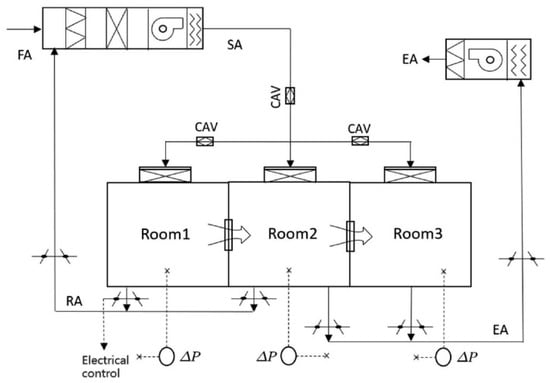Schematic diagram of how the automatic mode controls air volume [47]. Copyright 2021 Elsevier. Note: FA (Fresh Air), SA (Supply Air), EA (Exhaust Air), RA (Return Air), and CAV (Constant Air Volume).