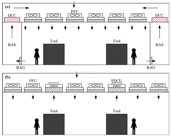 Schematic diagram of supply and return air recirculation system in cleanrooms [59]. Copyright 2014 Elsevier. (a) Traditional wall–return air recirculation. (b) FDCU return system for air recirculation. Note: RAS (Return Air Silencer) and RAG (Return Air Gril).