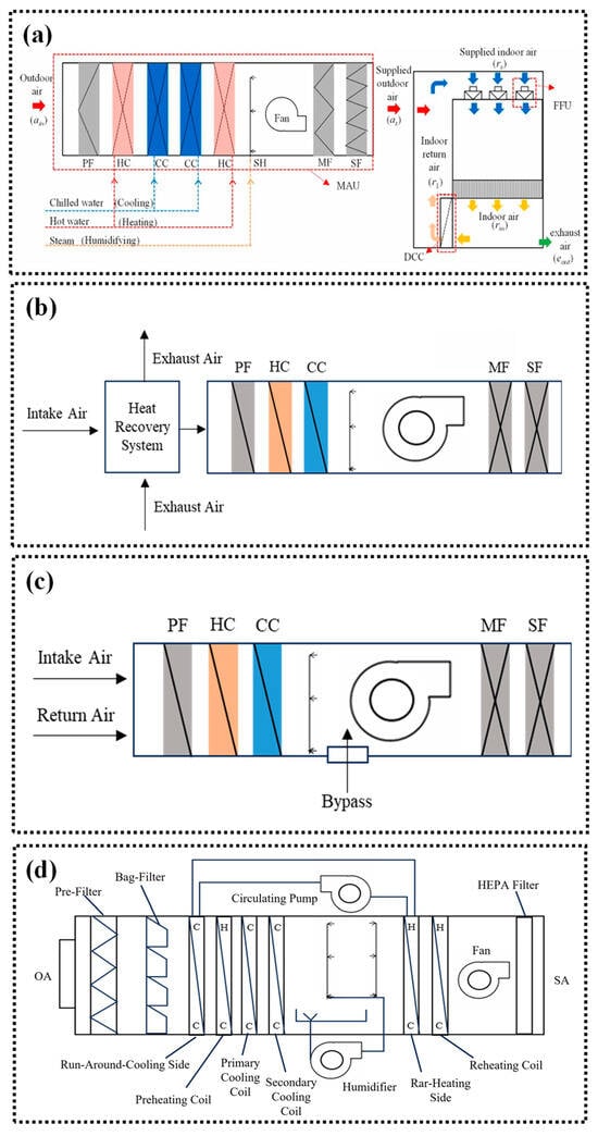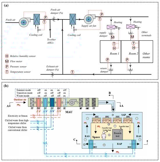 In cleanroom air conditioning systems, the treatment of air temperature and humidity (including cooling, heating, humidification, and dehumidification) is primarily conducted by the MAU. However, due to the need for multiple heat and moisture exchange, the overall energy consumption of the MAU is relatively high. Cold–heat offset is the key factor contributing to the energy waste. After cooling and dehumidification, the air must be reheated to meet the required temperature and humidity settings, resulting in the simultaneous consumption of cooling and heating energy, thereby causing unnecessary energy losses [76]. Research by Yin et al. indicated that cold–heat offset accounts for approximately 13.1–18.0% of the total energy consumption in the system [77]. Therefore, reducing cold–heat offset has become an important research focus for improving energy efficiency [78]. Various optimization strategies have been proposed, including demand reduction, heat recovery adoption, and temperature–humidity decoupled strategies, aiming to reduce system energy consumption and enhance energy utilization efficiency.