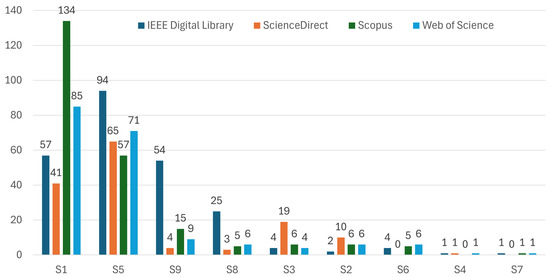 Figure 2 presents a distribution of individual contributions from each data resource per search string within the entire found collection. It highlights the relative impacts of the S1-S5-S9 strings and IEEE/Scopus databases on the SLR proposed by this work.
