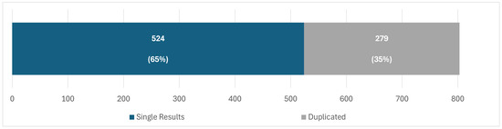 In accordance with Section 2.2.2, a deliberate large number of 803 selected (and original) studies was successfully achieved due to the set of nine search strings described in Table 3. Such an achievement corresponds to the first round of study selection of this SLR. The second round dealt with a deeper check-up on the entire collection to identify duplicated contributions, which might be gathered from different data resources or not (i.e., a platform’s inner malfunction).
