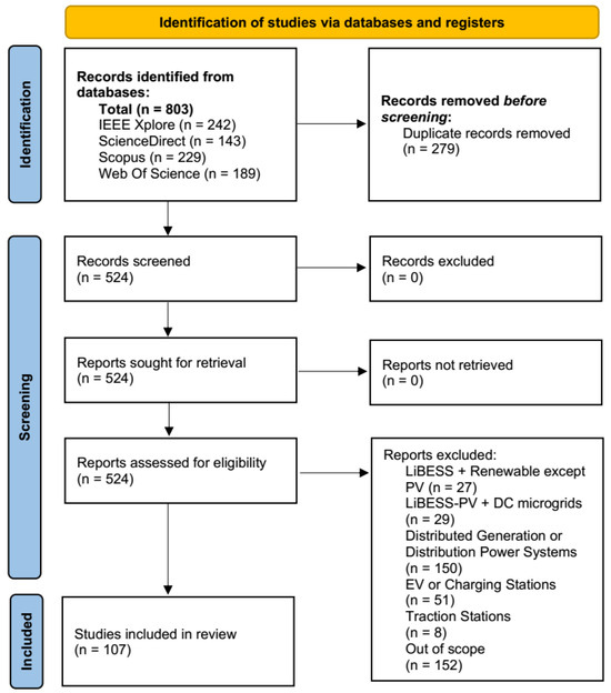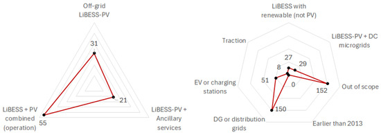 In this work, an expected higher number of exclusion criteria matches with a more detailed (or sensitive) study categorization. After processing one more round of study selection, the items listed in Table 4 also justify why one specific study should be now relabeled as “accepted” or not (rejected). For instance, any previously selected study integrating LiBESSs with any renewable source rather than PV generation should (at this new round of study selection) be classified as out of scope (or irrelevant) and rejected for this work.