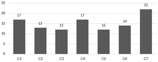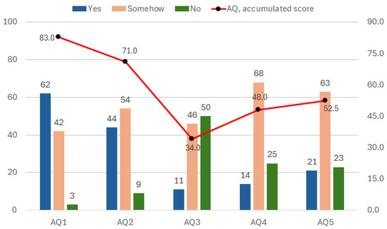 A secondary curve shown in Figure 7 also reflects such observations due to an estimation of accumulated scores per AQ. Following the respective weights presented in Table 5, the number of registered answers per AQ provides an average value of how pertinent an AQ might be. Again, AQ1, AQ2, and AQ5 appear to be the most predominant ones (on average).