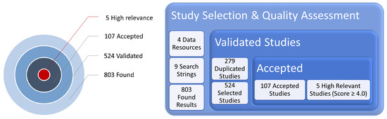 Based on the search strings described in the Table 3, this work deliberated over a total of 36 different search engines (nine search strings for each of four data resources) in February 2025. As a result, they provided an entire collection of 803 publication reviews from all data resources. Each adjusted search string contributed the following number of collected studies: (S1) +317; (S2) +24; (S3) +33; (S4) +3; (S5) +287; (S6) +15; (S7) +3; (S8) +39; and (S9) +82 studies.